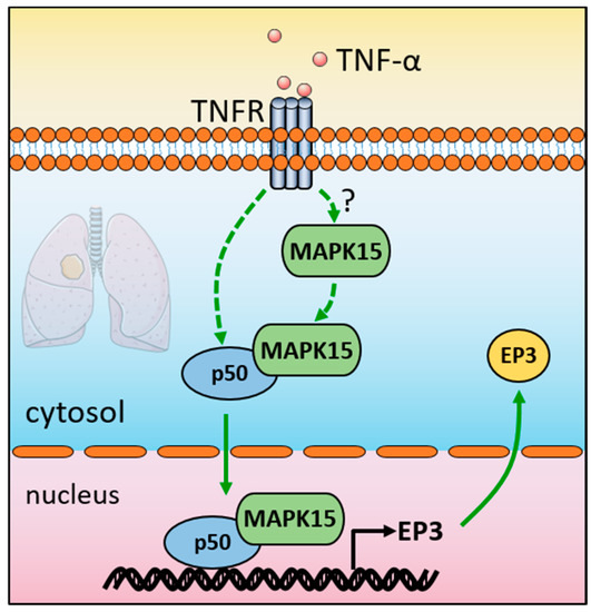 Schematic diagram of MAPK15 transcriptionally regulating EP3 by interacting with NF-κB p50 subunit and promoting LUAD metastasis. Question mark (?) indicates that how TNF-α affects MAPK15 in the cytosol is still unclear.