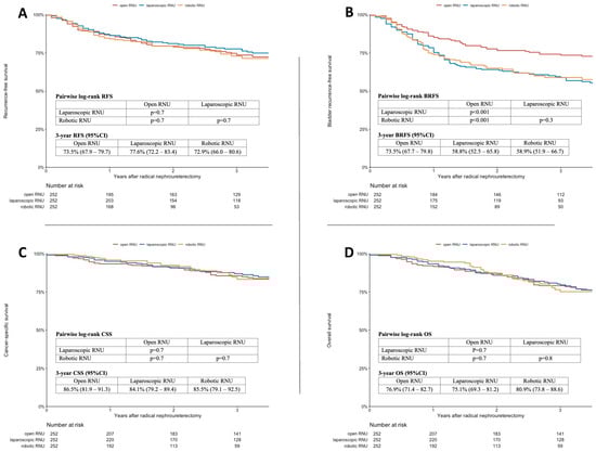The 3-year estimates for RFS, BRFS, CSS, and OS, as well as the associated Kaplan–Meier curves and pairwise log-rank tests, are provided in Figure 1A–D. While there was no difference in the pairwise log-rank tests for the 3-year RFS, CSS, and OS between the three surgical approaches, improved BRFS was observed for ORNU (3-year BRFS: 73.5% (67.7–79.8)) compared to LRNU (3-year BRFS: 58.8% (52.5–65.8); pairwise log-rank: p < 0.001) and RRNU (3-year BRFS: 58.9% (51.9–66.7); pairwise log-rank: p < 0.001).