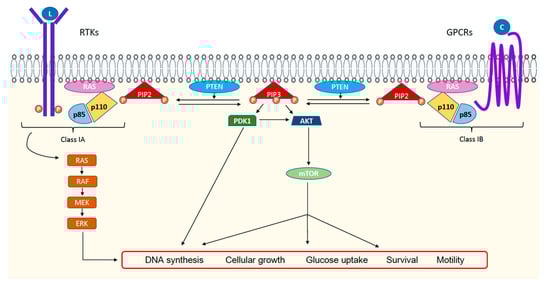 Class IA features tyrosine kinase receptors (RTKs) and class IB has G-protein-coupled receptors (GPCRs). When a growth factor (L) or a chemokine (C) activates the receptor, PI3K is recruited to the cellular membrane and is activated, thus phosphorylating phosphatidylinositol 4,5 biphosphate (PIP2) to generate phosphatidylinositol 3,4,5 triphosphate (PIP3). PIP3 recruits and binds to protein kinase B (AKT). Then, AKT is phosphorylated and activated by 3-phosphoinositide-dependent protein kinase 1 (PDK1) and mammalian target of rapamycin complex (mTOR), triggering several phosphorylation-based signaling cascades. PI3K plays a central role in several cellular processes, including DNA synthesis, cellular growth, metabolism, survival, and cell motility.