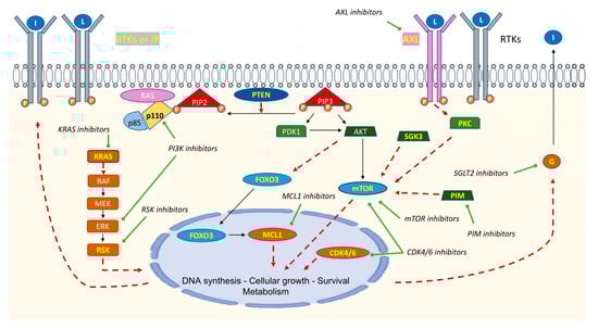 Some of the adaptive mechanisms of resistance to PI3K inhibitors are described here (shown in yellow in the figure), along with their consequences (shown with red dotted arrows) and potential therapeutic possibilities (shown with green arrows). Loss of the tumor suppressor phosphatase and tensin homolog (PTEN) can appear before or after PI3K inhibitor use and lead to phosphatidylinositol 3,4,5 triphosphate (PIP3) overexpression. All PI3K inhibitors induce a disruption in the carbohydrate metabolism with hyperglycemia; hyperglycemia brings feedback that leads to insulin upregulation and reactivation of tyrosine kinase receptors (RTKs). Activation of mTOR, independent of protein kinase B (AKT), represents an important part of acquired resistance to PI3K inhibitors. We can find many paths of resistance, including the serum and glucocorticoid-regulated kinase 3 (SGK3), the proviral integration of Moloney virus (PIM), or PKC via activation of AXL and RTKs; these molecules induce activation of mTOR and, therefore, the pathway. AKT inactivation induces hypophosphorylation of Forkhead Box O 3 (FOXO3) and allows for the nuclear localization of FOXO3. FOXO3 induces myeloid cell leukemia-1 (MCL1) activation and upregulation of RTKs, leading to survival and overexpression of the PI3K pathway, respectively. In the RAS/MEK/ERK pathway, the PI3K inhibitor can inhibit ERK; however, the appearance of the KRAS mutation can induce activation of the pathway, despite ERK inhibition, and it has been observed that PI3K inhibitors induce upregulation of RPS6KA2 (RSK3) and RPS6KA6 (RSK4). L: ligand; IR: insulin receptor; PKC: protein kinase C; G: glucose; I: insulin.