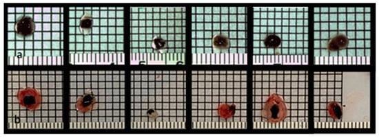The extended perseverance of the rings until removal was associated with a higher dissociation of the tumors. In group 1, fragments of the tumor mass remained adherent to the inner circle of the rings while lifting the rings, despite careful surgical dissemination of the margins (Figure 5a–c). Furthermore, larger tumor samples did not fit and could not be adjusted inside the ring, resulting in damage to parts of the implanted grafts during ring removal (Figure 4a,b).