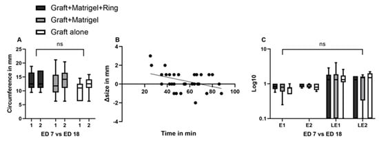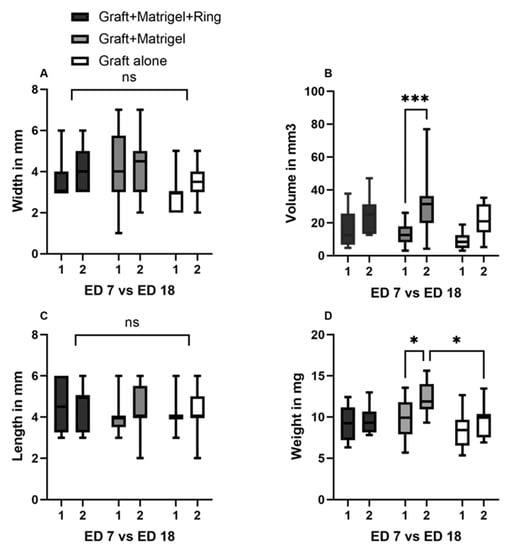 In group 1 the implanted grafts showed a mean length of 4.6 mm (±1.3 SD), a mean width of 3.7 mm (±1.1 SD), and a mean thickness of 1.4 mm (±0.4 SD) before implantation, and 4.5 (±1.08 SD), 4.1 mm (±1.06 SD), and 2.5 mm (±0.5 SD) after dissection. The same parameters had values of 4 mm (±0.8 SD), 4 mm (±1.7 SD), and 1.5 mm (±0.4 SD) before implantation and 4.3 mm (±1.1 SD), 4.2 mm (±1.3 SD), and 2.9 mm (±0.6 SD) on ED18 for group 2. In the group without Matrigel or a ring, a mean length, width, and thickness of 4.1 mm (±0.75 SD), 2.8 mm (±0.9 SD), and 1.4 mm (±0.4 SD) were measured on ED7 and 4.3 mm (±1.2), 3.5 mm (±0.8 SD), and 2.5 (±0.3 SD) on ED18, respectively. In all groups, the length and width showed an increase between ED7 and ED18, which was not significant (Figure 3A,C). A statistically significant difference (p = 0.0007) between the volume on ED7 and ED18 could only be seen in group 2 with Matrigel (Figure 3B). Furthermore, a statistically significant increase in weight was documented in the same group during the development process (p = 0.0216). Among the tested groups, there were no significant differences in length, width, or volume, whereas the weight on ED18 varied significantly between groups 2 and 3 (p = 0.0218) (Figure 3D).