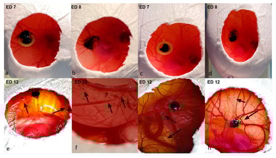 The tumors implanted with Matrigel and ring (Figure 4a,c) showed a higher detachment of the peripheral sections of the grafts after the removal of the rings on ED8 (Figure 4b,d), whereas a similar loss of cohesion, resulting in the detachment and migration of fragments apart from the main tumor body, was noted in group 3 after ED12 (Figure 4e,g,h). Pigmentation of the lower CAM was predominantly documented in group 3 (0%, 12.5%, and 33.3%) (Figure 4f).