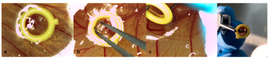 Removal of the rings on ED8 of uveal melanoma patient-derived tumor grafts in group 1 with Matrigel and a ring. (a) Tumor graft with Matrigel and a ring on ED7, (b) dissemination of the tumor margins along the inner circle of the plastic ring with forceps on ED8, (c) slowly turning and lifting the ring with a forceps while holding the graft in its implantation site with a ball burnisher to avoid involuntary explantation on ED8, (d) removed ring with fragments of the tumor on ED8.