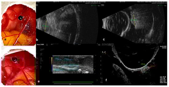 Ultrasound as a monitoring instrument to evaluate the growth of the implanted tumors in the CAM Model. (a–c) Examples of the evaluation of size with the B-Scan ophthalmic ultrasound, where the tumor, implanted with Matrigel, was measured directly with the 10 MHz probe; it presents as a hyperechoic ellipsoid mass on the surface of the CAM, (b) and subsequently with the latex fingerstall filled with water for the adjustment of depth as well as for the acquisition of images of higher definition. (c–f) Examples of the evaluation of graft size via a preclinical imaging system with ultra-high-frequency ultrasound (e) and ultrasound biomicroscopy (f) after implantation without Matrigel.
