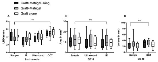 The mean LBD values were calculated to be 2.8 mm (±0.9 SD), 3.4 mm (±1.1 SD), and 3.8 mm (±1 SD) with IR, 3.5 mm (±0.9 SD), 4 mm (±1 SD), and 3.9 mm (±1.1 SD) with ultrasound, and 4.9 (±0.8 SD), 4.8 mm (±1 SD), and 5.2 mm (±0.9 SD) with OCT on ED18 for groups 1, 2, and 3, respectively. No statistically significant differences could be detected with respect to the LBD among the measurements of the samples after dissection and the various tested monitoring modalities (Figure 9A). The cross-sectional area was calculated mathematically based on the size parameters of the excised fragments and further compared with the calculation of area via ultrasound with the Vevo3100 device, as well as with infrared imaging. Significant differences were not detected among the tested monitoring modalities regarding the cross-sectional area (Figure 9B). Moreover, the volume was calculated based on the excised samples’ size parameters and was compared with the volume measured with data from the OCT assessment. No significant differences could be documented among the tested groups and instruments (Figure 9C).