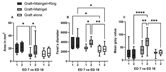 The Feret’s diameter is a measure of an object’s size along a specified direction. It was measured with Image J, as an additional size parameter, to quantitatively compare the three tested implantation techniques and to further investigate the dimensional changes and mass distribution during the tumor attachment and growth into the CAM. A significant deviation of values was demonstrated for group 3 compared with group 1 on ED7 (p = 0.03) and compared with both groups 1 (p = 0.01) and 2 (p = 0.004) on ED18. Between ED7 and ED18, a significant difference was estimated only for group 2, displaying an apparent increase in size for the grafts implanted with Matrigel alone (p = 0.01) (Figure 10B).