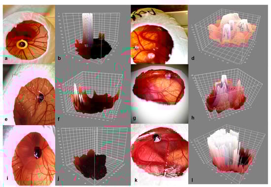 The three-dimensional surface plot plugin was investigated as an alternative non-invasive instrument for the evaluation of mass expansion and volume increase during the development phase and for the detection of their differences among the three tested groups (Figure 11a–l). The uveal melanoma grafts implanted into the CAM with Matrigel with or without a ring displayed a greater increase in volume in comparison with group 3 without viscoelastic support (Figure 11d,h,l). On the other hand, tumors in group 1 with Matrigel and a ring showed a lower mass density in comparison with group 2 with Matrigel alone (Figure 11d,h). Furthermore, all groups formed ellipsoid tumors, while the grafts implanted with Matrigel developed an almost conic arrangement of the tumor tip and exhibited a more inhomogeneous configuration.