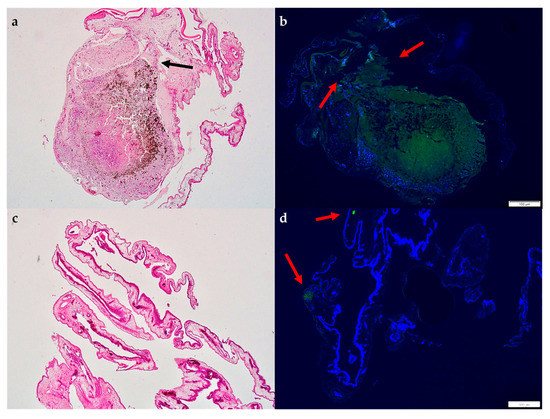 Images of H&E staining and fluorescence microscopy of an excised patient-derived UM-xenograft, as well as of the lower CAM. (a) Hematoxylin and Eosin staining of the tumor nodule implanted with Matrigel with a depiction of the folding of the CAM around the tumor graft, as well as the dispersion and invasion of the pigmented cells in depth under the tumor base (arrow), (b) fluorescent microscopy after the application of melanoma-specific staining (green) for the identification of uveal melanoma cells (arrows), scale 100 µm, (c) hematoxylin and eosin staining of the lower CAM, (d) fluorescent microscopy of the lower CAM with weakly visible signaling of melanoma cells (arrow), scale 100 µm.