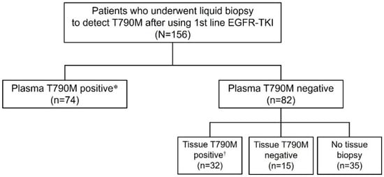 A total of 156 patients underwent liquid biopsies using plasma samples (Figure 1). A total of 308 re-biopsies (including plasma and tissue samples) were performed in 156 study subjects as follows: 64 (41%) underwent only one liquid biopsy, and 92 (59%) underwent two or more re-biopsies with tissue or plasma samples (an average of 2.6 biopsies per person). The overall detection rate of the T790M mutation was 68% (106 of 156 patients), and plasma positive and plasma false negative groups were found in 74 and 32 patients, respectively.