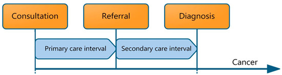 Delay in recognition, referral, and diagnosis of cancer patients can have a substantial impact on the disease burden and prognosis [9,10]. Such delay is associated with later stages of cancer at diagnosis, more invasive treatments, greater impacts on patient lives and quality of life, and worse morbidity and mortality [9,10]. In countries with primary care-based healthcare systems, the diagnosis of cancer largely occurs through the general practitioner (GP), with previous studies demonstrating that over 80% of cancer patients in Western Europe are diagnosed after contact with their GP [11]. The first steps in the diagnostic process are integral for timely diagnosis and treatment; patients first recognize their symptoms, then present to their GP, who details these symptoms, investigates them if needed, and, if indicated, refers the patients to secondary care for diagnosis and treatment [12].