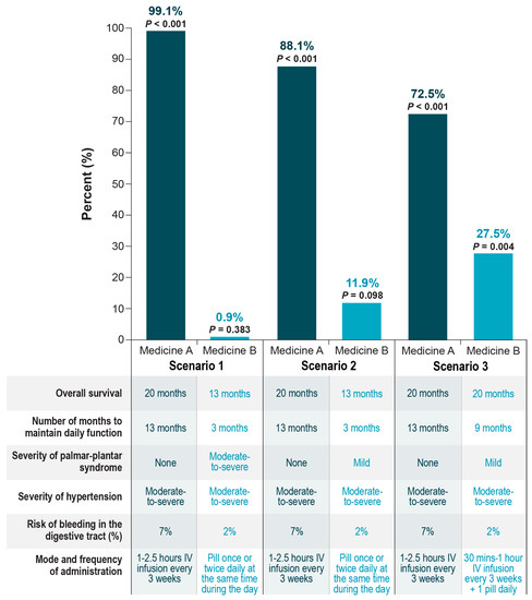 In a simulation exercise to relate the preference weight estimates to scenarios representing real-world treatment choices, we estimated the probability that an average respondent would select one treatment profile over another, where the treatment profiles were defined by clinically plausible combinations of the attribute levels (Figure 3). Scenarios 1 and 2 were identical except for the level of palmar-plantar syndrome, which was moderate-to-severe for Medicine B in scenario 1 and was mild for Medicine B in scenario 2. Scenario 3 compared profiles for two medicines that differed in months of daily function, level of palmar-plantar syndrome, risk of bleeding in the digestive tract, and mode and frequency of administration. An average respondent had approximately a 99.1% likelihood of selecting Medicine A in scenario 1; approximately an 88.1% likelihood of selecting Medicine A in scenario 2; and approximately a 72.5% likelihood of selecting Medicine A in scenario 3. In scenario 1 and scenario 2, a greater risk of digestive tract bleeding in the digestive tract and IV dosing were outweighed by longer OS, maintaining daily function for more time, and a lack of palmar-plantar syndrome. In scenario 3, a greater risk of bleeding in the digestive tract was outweighed by a lack of palmar-plantar syndrome, maintaining daily function for more time, and IV-only dosing.