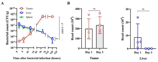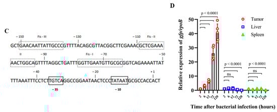 The fate of bacteria injected into tumor-bearing mice through the tail vein was examined using a common laboratory strain of E. coli, MG1655. E. coli MG1655 (1 × 108 CFU/mouse) was injected into BALB/c mice bearing CT26 colon cancer xenograft tumors. At the indicated times after the injection, bacterial numbers were counted in the RES, in the liver and spleen, and in tumors using plating methods (Figure 1A). At 2 h after the injection, there were approximately 1 × 107 CFU in the RES, and this number decreased gradually in a time-dependent manner, reaching approximately 5 × 104 CFU at 120 h. The bacterial number in tumors was 1 × 104 CFU at 2 h after the injection, and this increased to approximately 5 × 108 CFU at 72 h. This result indicates that although ~0.01% of the injected bacteria accumulated in tumor tissues initially, the immunocompromised environment allowed substantial proliferation of those bacteria, whereas those in the RES were cleared presumably by phagocytic immune cells (see below). Among the most activated genes the most highly induced was the rrnB operon, consisting of the transcription unit rrsB-gltT-rrlB-rrfB encoding the three major rRNA building blocks of ribosomes []. The expression profile of the rrnB operon (number of reads) was determined by RNA sequencing (Figure 1B). The normalized read coverages in the liver and tumor were 58,220 and 1,148,213 reads at 1 dpi, respectively. At 3 dpi, these values changed drastically because of a shortfall of reads in the liver, showing 67 and 1,780,236 reads for the liver and tumor, respectively. We hypothesized that the reads on day 1 in the liver were remnants of those from overnight culture. By day 3, the bacteria in the liver were perishing as rrnB expression ceased, whereas those in the tumor proliferated. To confirm these findings, we measured the activity of the rrnB P1 promoter, which is the major promoter driving the rrnB operon. This promoter is active during the early exponential phase of growth, when ribosomes are needed most, and declines sharply thereafter during the stationary phase []. Three Fis-binding sites in the upstream activation region are responsible for the activation of the rrnB P1 promoter (Figure 1C) []. A gene reporter system was constructed using the unstable GFP variant gfpOVA [], which was cloned downstream of rrnB P1 in pBR322, generating prrnBP1-gfpOVA. E. coli transformed with this plasmid were used to monitor rrnB P1 activity. During growth in vitro (Figure S2A), fluorescence intensity determined at 488–522 nm indicated activation of rrnB P1 during the exponential phase of growth in LB medium, in agreement with the results of qPCR analysis of gfpOVA structural RNA. Then, we attempted to determine rrnB P1 activity in the E. coli injected into tumor-bearing mice using a fluorescence microscope; however, this failed due to weak emission of fluorescence. Alternatively, we measured rrnB P1 activity by qPCR analysis of the gfpOVA structural RNA relative to rpoB RNA, which is maintained at constant levels (Figure 1D) []. The activity of rrnB P1 increased by up to 40-fold in the bacteria in tumor tissues at 120 h, whereas those in the liver and spleen decreased over time. This result supports that those bacteria in tumor tissues proliferated, whereas those in the RES perished. We did not quantify the rRNA from the genomic rrnB operon because there are seven rrn operons in E. coli with similar sequences, and the ribosomal RNAs that provide the foundation for ribosomes are extremely stable.