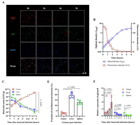 Fate of ΔppGpp S. Gallinarum injected into tumor-bearing mice. (A) Images of ΔppGpp S. Gallinarum cross-linked with a red fluorescent dye (Flamma® Fluors 552 NHS ester) grown in LB medium for the indicated amounts of time. Bacteria stained with a fluorescent antibody are shown in green and DAPI-stained nuclei are shown in blue. Scale bar = 5 µm for 1000× magnification. (B) The red fluorescent bacteria were grown in LB with vigorous aeration. At the indicated time points, samples were collected to measure cell mass (A600) and red fluorescent signals using a fluorometer at an excitation wavelength of 550 nm and an emission wavelength of 610 nm. A.U. = red fluorescent signal/A600. (C) ΔppGpp S. Gallinarum was intravenously injected into CT26 tumor-bearing mice (n = 4/group, 1 × 108 CFU/mouse) when tumor size reached 130–150 mm3. Bacterial loads from isolated tumors, livers, and spleens were determined at the indicated times after the injection (related to data shown in Figure S3). (D) The fluorescent bacteria were intravenously injected into mice grafted with CT26 cancer cells (n = 5, 1 × 108 CFU/mouse). The Salmonella in tumors, spleens, and livers at the indicated time points were observed under a confocal microscope. Bacteria cross-linked with Flamma® Fluors 552 NHS ester are shown in red, bacteria stained with a fluorescent antibody are shown in green, and DAPI-stained nuclei are shown in blue. Yellow arrows indicate merged red and green bacterial signals. Scale bar = 10 µm for 800× magnification. (E) The fractions of red fluorescent bacteria (indicated by arrows) among green bacteria (total number) in each organ and tumor tissue at 12 h postinjection are shown in a graph (fraction of red fluorescent bacteria = red/green × 100, %). Results are expressed as the mean ± SD from five sections, unpaired Student’s t-tests, p < 0.0001. (F) ΔppGpp S. Gallinarum carrying prrnBp1-gfpOVA (SMP4001) was administered to CT26-grafted mice (n = 5/group) via the tail vein, and gfpOVA expression from the rrnB P1 promoter in the bacteria in tumors, livers, and spleens at the indicated time points was determined by quantitative real-time PCR. The gfpOVA Ct values were calculated relative to S. Gallinarum rpoB Ct values in triplicate. All data are expressed as the mean ± SD. Significant differences are shown as p < 0.05 (unpaired Student’s t-tests; ns: not significant).