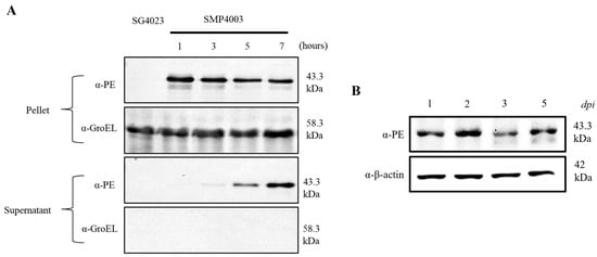 To examine the expression of the TP protein in vitro, overnight cultures of ΔppGpp S. Gallinarum (SG4023) and ΔppGpp ΔglmS S. Gallinarum harboring the plasmid prrnBP1-psp-TP (SMP4003) were subcultured in LB broth (1:100) and grown for 7 h. At the indicated time points, bacterial pellets were collected and sonicated in 1× PBS. The supernatants were collected and filtered through 0.2 µm filters (GVS Filter Technology, USA). For animal experiments, SMP4003 (1 × 108 CFU/mouse) was injected into the mice grafted with CT26 tumors through the tail vein when tumors reached 130–150 mm3. Tumors were excised at the indicated days and homogenized in 1 mL RIPA buffer (Intron Biotechnology, Seongnam, Republic of Korea) containing 1× Protease & Phosphatase Inhibitor Cocktail and 1× EDTA (Thermo Scientific). The filtered supernatants were mixed with 6× SDS and boiled at 95 °C for 10 min. The proteins were loaded onto 10% SDS-PAGE gels and transferred to nitrocellulose membranes (GE Healthcare, Solingen, Germany, cat no. 10600002). TP expression was determined by western blot analysis using a primary polyclonal antibody against PE38 (Sigma-Aldrich, P2318, antirabbit, 1:5000). Spontaneous bacterial lysis was examined by detecting GroEL using a specific antibody (Sigma-Aldrich, G6532, antirabbit, 1:5000). The level of β-actin was determined using a specific rabbit polyclonal antibody (Abcam, ab8227, 1:2000). Membranes were incubated with primary antibodies diluted in 5% skim milk in TBST at 4 °C overnight, followed by incubation in mouse antirabbit IgG-HRP (Santa Cruz Biotechnology, Dallas, TX, USA, sc-2357, 1:2000) for 1 h at room temperature. The proteins were visualized using ECL (Thermo Scientific, REF. 32209).