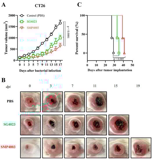 - Yun, M.; Pan, S.; Jiang, S.-N.; Nguyen, V.H.; Park, S.-H.; Jung, C.-H.; Kim, H.-S.; Min, J.-J.; Choy, H.E.; Hong, Y. Effect of Salmonella Treatment on an Implanted Tumor (CT26) in a Mouse Model. J. Microbiol. 2012, 50, 502–510. [Google Scholar] [CrossRef]