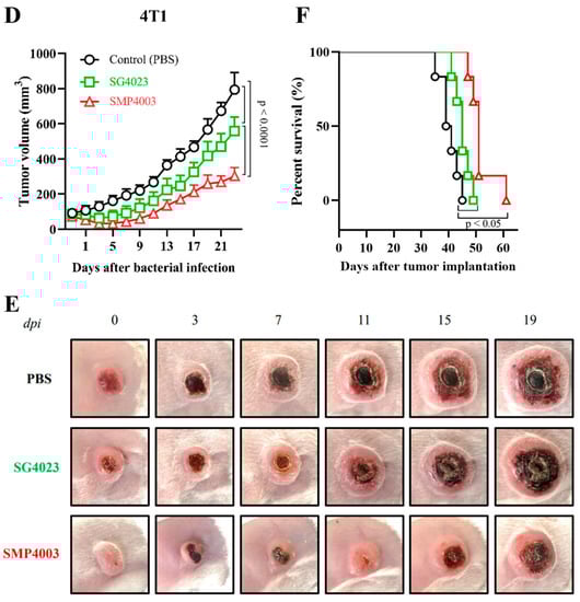The expression and secretion of TP from tumor targeted ΔppGpp S. Gallinarum carrying the prrnBP1-psp-TP (SMP4003) plasmid were evaluated in BALB/c mice grafted with mouse colon cancer CT26 cells (Figure 3B). At the indicated days after tail vein injection of the bacteria (1 × 108 CFU), the grafted tumors were isolated and homogenized, and the supernatant was separated by centrifugation and filtered through 0.2 µm pores. The filtrate was analyzed for TP protein (43.3 kDa) expression by western blotting. TP was detected constantly throughout the course of the experiment from 1 to 5 dpi, suggesting that the protein was expressed constitutively from the rrnB P1 promoter and released from bacteria through the psp signal peptide. Next, we evaluated the antitumor effects of the immunotoxin on CT26 and mouse breast cancer 4T1 cells implanted into BALB/c mice (Figure 4). All mice received an intravenous injection of (i) PBS, (ii) ΔppGpp S. Gallinarum (SG4023) alone, or (iii) SG4030 carrying prrnBP1-psp-TP (SMP4003). Administration of SG4023 bacteria alone inhibited tumor growth for up to approximately 10 days compared with that in the PBS-treated group in both tumor models. Expression of the immunotoxin by the rrnB P1 promoter decreased tumor growth further. Average tumor size changes are shown in Figure 4A,D and the representative pictures are appeared in Figure 4B,E. The tumor sizes of individual mouse were also checked (Figure S5A,C). Negative effects on the health of mice were rarely observed, and there was no significant difference in the body weight of mice between the groups (Figure S5B,D). The mice treated with ΔppGpp S. Gallinarum expressing the immunotoxin survived 10–15 days longer than the mice treated with PBS or ΔppGpp S. Gallinarum alone (Figure 4C,F). Taken together, the results suggest that TP expressed from the constitutive rrnB P1 promoter in ΔppGpp S. Gallinarum effectively suppressed tumor growth without any additional manipulation and without causing side effects.