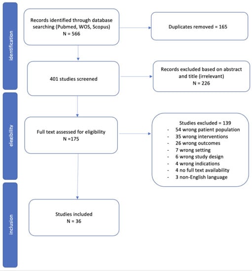 The literature search yielded 566 articles; after duplicate removal, 401 titles and abstracts were reviewed (Figure 1). Of these, 226 papers were excluded based on abstract and title; 175 articles were assessed for eligibility and full text screened. Of these, 139 articles were excluded. Finally, a total of 36 articles dated between 2006 and 2022 fulfilled the selection criteria and were included in this systematic review [19,20,21,22,23,24,25,26,27,28,29,30,31,32,33,34,35,36,37,38,39,40,41,42,43,44,45,46,47,48,49,50,51,52,53,54]. There was no disagreement between the authors regarding eligibility. The articles consisted of 33 retrospective and three prospective reports, gathering a total of 1859 patients. Characteristics of the included studies are summarized in Table 2.