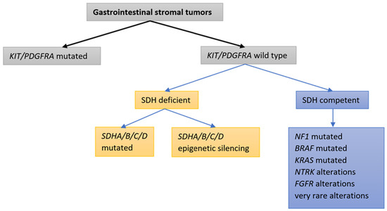Gastrointestinal stromal tumors (GISTs) are the most common mesenchymal neoplasms of the gastrointestinal tract, but they account for less than 1% of all gastrointestinal tumors. Incidence varies worldwide from 4.3/1 × 106 inhabitants per year to 21.1/1 × 106 inhabitants per year [1,2,3,4,5,6,7]. The incidence of GISTs is expected to be underestimated [8]. Most GISTs are indolent in their course and are discovered incidentally, but some are aggressive and disseminate early [8,9]. Gastrointestinal stromal tumors generally arise from pacemaker (Cajal) cells anywhere in the digestive tube—from the esophagus to the rectum—but, more recently, evidence has shown that they can also arise from telocytes or smooth muscle cells [10,11,12]. They are a heterogeneous group of diseases of different molecular subtypes, with oncogenesis mainly resulting from mutually exclusive activating mutations, most commonly in the KIT proto-oncogene (KIT) or the platelet-derived growth factor receptor alpha gene (PDGFRA) [13,14]. Around 5% of GISTs are syndromic and associated with germline mutations in genes encoding for KIT, PDGFRA, succinate dehydrogenase B/C/D (SDHB/C/D) (Carney Stratakis syndrome), and neurofibromin or with epigenetic silencing of SDHC (nonhereditary Carney triad syndrome) [15,16,17,18,19,20,21]. Patients confirmed to have GISTs with neurofibromin 1 (NF1) mutation or a deficient SDH complex should be referred to the outpatient clinic for genetic counseling.