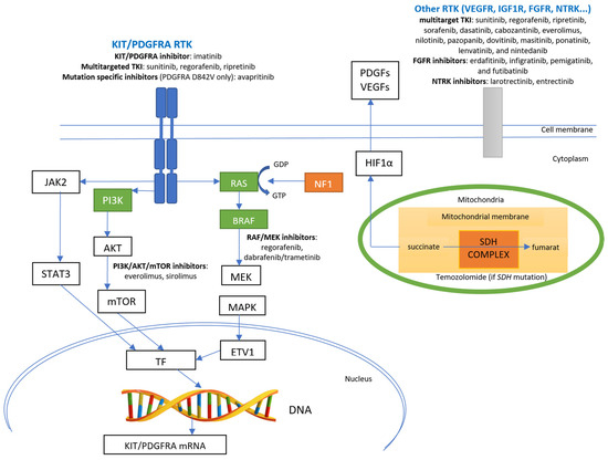 Principal molecular pathways for GISTs and sites of action of specific pathways’ inhibitors. Green boxes indicate kinases with gain-of-function mutations (RAS, BRAF, and PI3K genes); orange boxes indicate proteins with loss-of-function (mutations in the NF1 gene and loss of function of the SDH complex—either loss of function mutations in genes coding for SDH subunits or epigenetic silencing of the SDHC gene). TF—transcription factor; ETV1—ETS variant transcription factor 1; RTK—receptor tyrosine kinase; TKI—tyrosine kinase inhibitor; DNA—deoxyribonucleic acid.