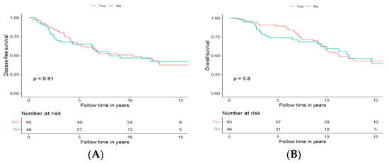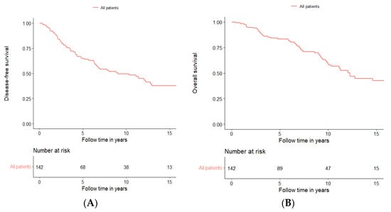 Initial survival analysis for DFS and OS was performed including all 142 patients treated with curative intent, irrespective of treatment modality. For this cohort, the 5-year DFS was 64.9%, the 10-year DFS was 49.6%, and the 15-year DFS was 37.7%, while the 5-year OS was 83.5%, the 10-year OS was 59.4%, and the 15-year OS was 42.5% (Figure 1A,B, respectively, and Supplementary Table S1).