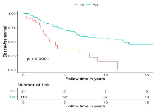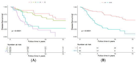 As mentioned above, of the 142 patients, 34 (23.9%) presented tumours in stage I, 43 (30.3%) in stage II, 20 (14.1%) in stage III, and 45 (31.7%) in stage IV. Patients presented with the lower disease stage, treated with curative intent, had a significantly better DFS and OS, with DFS presented in Figure 6A and OS in Supplementary Figure S4A.