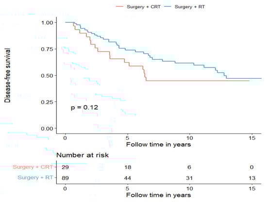 3.3.3. Long-Term Disease-Free Survival Separated for Treatment with Surgery and RT, and Surgery and CRT