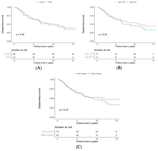 3.3.4. Long-Term Disease-Free Survival in Relation to Gender, Age, and Smoking in AdCC