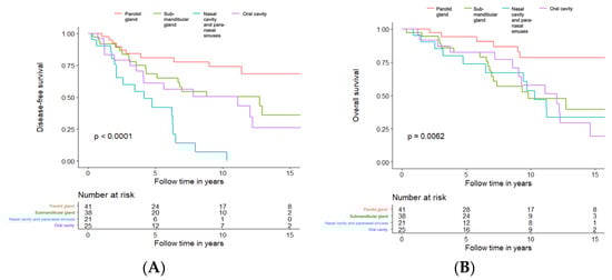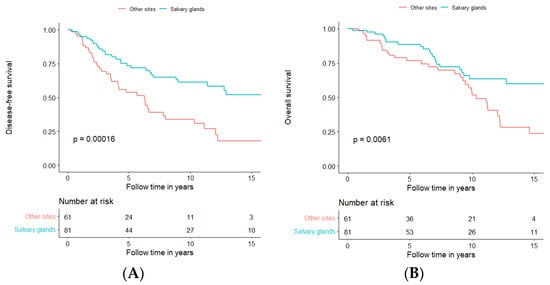 AdCC in major salivary glands had better DFS and OS compared to other sites (log-rank test, DFS: p = 0.00016; OS: p = 0.0061); more explicitly, five-year DFS and OS were 73.5% and 88.7%, respectively in AdCC of the major salivary glands as compared to 53.7% and 76.8%, respectively of AdCC in other sites. Moreover, 10-year DFS and OS for salivary glands were 61.3% and 63.6%, respectively, compared to 33.8% and 54.2%, respectively, for other sites. For further details and 15-year DFS and OS, see Figure 8A,B and Supplementary Table S1.