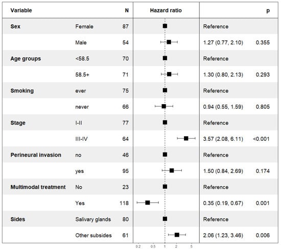 A multivariable subgroup analysis, including all patients treated with curative intent, irrespective of treatment modality, was performed. Multivariable analyses for DFS and OS were performed for gender, age, smoking status, stage of disease (I + II vs. III + IV), perineural invasion, and dichotomizing surgery and RT/CRT vs. surgery or RT/CRT alone, as well as subsites (Salivary glands vs. Other subsides). For DFS, see Figure 9 below and for OS, see Supplementary Figure S5. (Univariable analysis was very similar and is shown in Supplementary Table S2.)