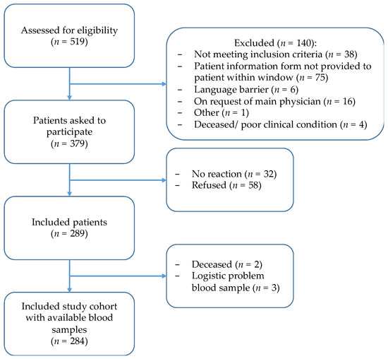 Of 519 children assessed for eligibility, 284 were included (Figure 1). Of the included children, 141 (50%) were diagnosed with leukemia, 74 (26%) with lymphoma, 38 (13%) with sarcoma and 31 (11%) with a brain tumor (Table 1). The median age at diagnosis was 9.4 years (range of 0.0–19 years), and 127/284 (45%) children were female.