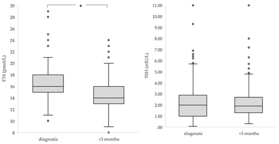 At time of diagnosis, 29% (82/284) of children had received corticosteroids <48 h earlier or chemotherapy before the first measurement. In this group, at diagnosis, lower median TSH and a higher median FT4 concentration were found when compared with those who had not (TSH, 1.20 (range of 0.07–11.00) versus 2.30 mIU/L (range of 0.34–9.40); p < 0.001; FT4, 17 (range of 11–28) versus 16 pmol/L (range of 10–29); p = 0.017). In the 22 children who had received corticosteroids <48 h before the blood withdrawal after three months, no differences were found in either TSH or FT4 concentration. (Supplementary File S2).
