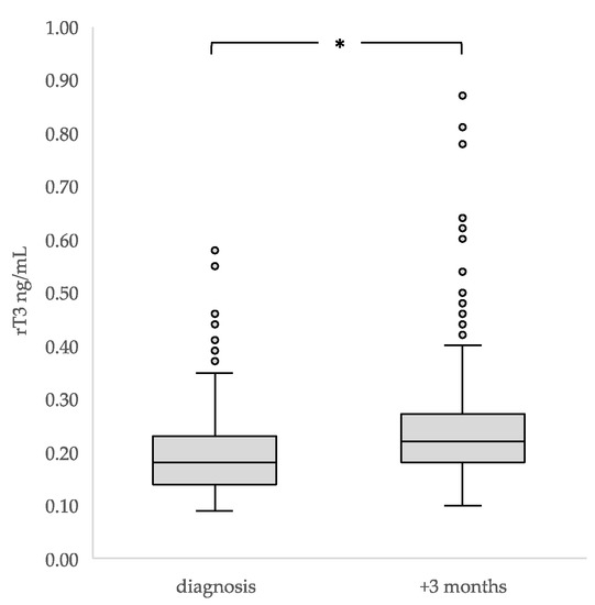Median concentrations and interquartile ranges of TSH, FT4 and rT3 in children at diagnosis and three months after diagnosis (n = 284). * The boxes show the IQR divided by the median, dots denote outliers.