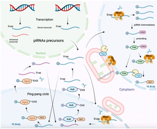 piRNAs synthesis and function. Mature piRNAs are generated from the processing of single-stranded RNAs transcribed from piRNA clusters in the genome, representing the largest class of non-coding RNAs found in most species. piRNAs can be also generated in the cytoplasm by a mechanism called the “ping-pong” cycle involving piRNA-directed antisense primary cleavage of transposon transcripts by Aubergine and PIWI proteins. piRNAs can modulate histone modifications and DNA methylation in a sequence-specific manner, leading to alterations in chromosomal conformation and gene expression regulation.