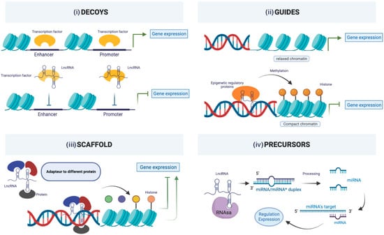 lncRNAs act via various pathways to regulate gene expression at different levels [135] with a biogenesis similar to mRNAs (Figure 3). Arbitrarily, lncRNAs are defined as being composed of more than 200 nucleotides mainly between 1000 and 10,000.