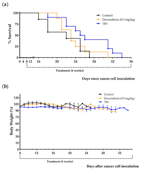 Anticancer effect of diet TB1 and doxorubicin in mice with TNBC (4T1 murine breast cancer cells inoculated in the tail vein of immunocompetent BALB/c mice). Survival (a) and body weight (b) of mice treated with doxorubicin (0.5 mg/kg/day, every week for a total of 4 doses), with diet TB1 (normal diet was replaced by TB1 for 28 days) or untreated mice (control, normal diet). Treatments began 8 days after the intravenous injection of 100,000 4T1 cancer cells. Body weight are expressed as percentage relative to the body weight at the beginning of the treatments (day 8). Data are from three independent experiments. The four mice fed diet TB1 that lived longer are from two independent experiments.