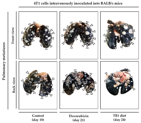 Lung photographs at the time of sacrifice of representative mice with TNBC. In this model, 100,000 4T1 murine breast cancer cells are inoculated in the tail vein of immunocompetent BALB/c mice. After 8 days, mice were treated with doxorubicin (0.5 mg/kg/day, every week for a total of 4 doses), with diet TB1 (normal diet was replaced by TB1 for 28 days) or untreated (control, normal diet). Mice were euthanized by cervical dislocation when signs of disease progression were apparent. After sacrifice, lungs were excised and stained with India ink (tumors show a white appearance and normal lung parenchyma appears black; some photographs show the unstained heart). Mice were sacrificed at different time points, when symptoms of advanced disease were patent. The day of sacrifice is shown in brackets.