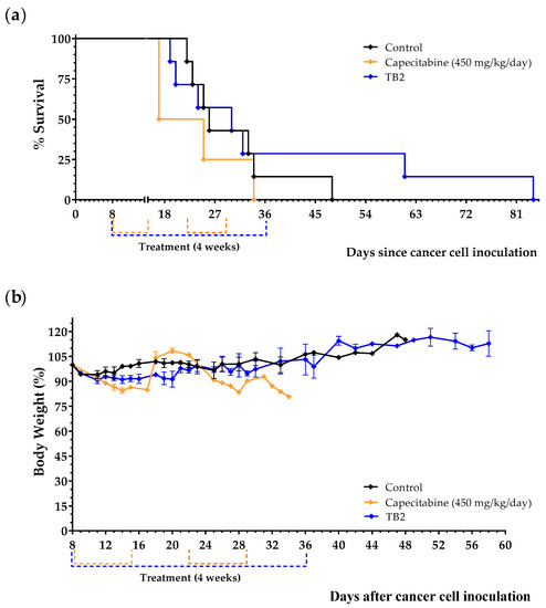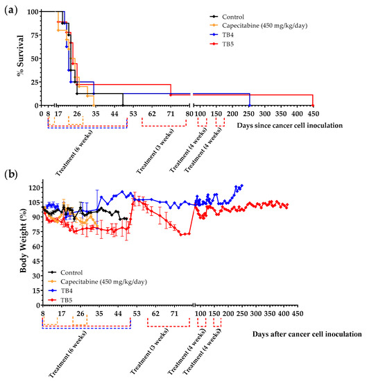 Anticancer activity of diets TB4 and TB5 and capecitabine in mice with metastatic TNBC cancer (4T1 murine breast cancer cells inoculated in the tail vein of immunocompetent BALB/c mice). (a) Survival of mice left untreated (control), treated with diet TB4 (6 weeks), treated with diet TB5 (6 weeks) or treated with capecitabine (450 mg/kg/day, 7/7 schedule, 3 cycles). (b) Body weights (mean percentage ± SEM) relative to the body weights of mice at the beginning of treatments (day 8). The two mice fed diet TB5 that lived longer are from the same experiment.