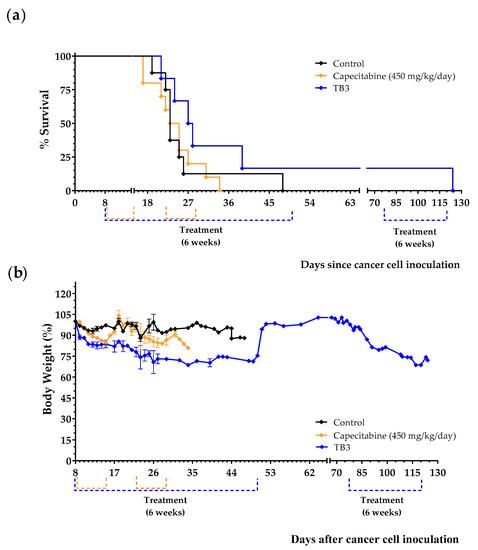 Treatments began 8 days after the tail vein injection of the 4T1 cancer cells. Animals were treated with diet TB3 (the normal diet was replaced by this diet for 6 weeks), with capecitabine (450 mg/kg/day, 7/7 schedule, 3 cycles) or were left untreated (control group). Mean survivals were 26.1 ± 3.2 in untreated mice, 43.8 ± 16.2 in mice fed diet TB3 and 24.2 ± 1.7 in mice treated with capecitabine. Most mice treated with diet TB3 lived longer than untreated mice (Figure 6a). One of the mice treated with diet TB3 survived the initial 6-week treatment and, after coming back to a normal diet for 4 weeks, treatment was restarted for an additional 6-week period. This animal was sacrificed on day 124 with cancer-related symptoms (decreased spontaneous motor activity and accelerated breathing), and the autopsy confirmed the presence of several tumors in the lungs. Although diet TB3 was well tolerated, body weights decreased continuously during treatment. Capecitabine also induced significant weight losses that also reverted at the end of each treatment cycle (Figure 6b).