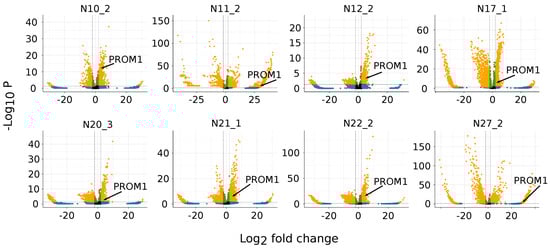 Volcano plot of the 8 clusters marked by PROM1. The number following the underscore of each title is the cluster ID. See Table S1 for the original names of the samples. The stippled lines represent the marker genes criteria: p-value < 0.05, and logFC > 2. Selected marker genes are the yellow dots on the right side of the volcano plot. For clusters N10_2, N11_2, N12_2, N17_1, N20_3, N21_1, N22_2, and N27_2, PROM1 ranks 66/702 (top 9.4%), 5499/5901 (top 93.2%), 236/917 (top 25.7%), 1269/2181 (top 58.2%), 628/764 (top 82.2%), 315/891 (35.3%), 152/739 (top 20.6%), and 1524/2943 (top 51.8%), respectively.