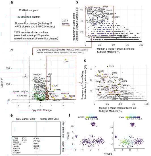 The procedure for the selection of stem-like markers of GBM that excel in both identifying stem-like subtypes within the tumor and being cancer-specific. (a) The process of selecting GBM stem-like subtype marker candidates. (b) The stem-like subtype marker candidates were evaluated based on their frequency of being a stem-like cluster marker and the corresponding significance shown by the median p-value across the represented clusters. The dots represent the 2173 unique stem-like marker candidates combined from the top 200 marker genes of the 28 stem-like clusters. (c) The expression level comparison between normal brain cells and GBM stem-like cells of 241 markers from the previous frequency–significance selection. The criteria for the orange genes are logFC > 1 and p-value < 0.01, and the criteria for the brown genes are 0.5 < logFC < 1 and p-value < 0.01. Both colors were considered significant in the comparison. (d) The genes selected to distinguish normal brain cells from GBM stem-like cells marked on the frequency–significance selection shown in Figure 2b. (e) Examples of the GBM stem-like markers that are cancer-specific and those that are not. BCAN, PTPRZ1, MAP2, OLIG1, ASCL1, etc. are non-cancer-specific. (f) Expression of BCAN and PROM1 in the GBM stem-like subtype. This example is from sample N20.