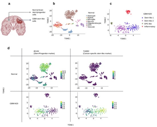 The expression of a general progenitor cell marker and cancer-specific stem-like marker for GBM. (a) Both GBM tumors and normal tissue possess progenitor cells. This illustration was created using BioRender.com. (b) TSNE for normal brain cells. (c) TSNE for the GBM cells from sample N20. (d) Comparing the expression of a general progenitor cell marker, BCAN, and a cancer-specific progenitor marker, TUBB3, between normal brain cells and GBM cells. The color bar with numbers represents the log-normalized counts of the gene.