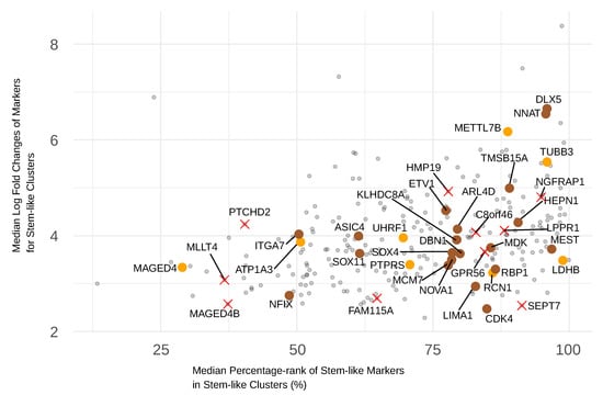 The expression level of a marker can be of crucial importance for some targeting assays [39]. Therefore, we present the relative expression level represented by percentage-rank and logFC (from the differential expression analysis among GBM clusters), for the 251 genes that passed the frequency–significance selection (Figure 4). The median percentage-rank across all GBM stem-like cells and the median logFC over all the GBM stem-like clusters were plotted together. Markers that are expressed at a high level compared with other genes in the same cells and meanwhile overexpressed by the stem-like clusters within GBM are shown (Figure 4). The markers that can distinguish GBM stem-like cells from normal cells are also marked in the same figure (Figure 4) to show the combined results.
