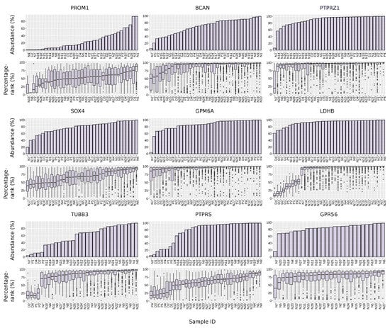 For some of the promising markers selected above, we examined their “abundance” (the proportion of cells that express non-zero values of the gene within a sample) and their percentage-rank across samples. The median abundance of PROM1 across samples is 18%. In comparison, BCAN, PTPRZ1, SOX4, and GPM6A, as representative markers from the frequency–significance selection, exhibit median abundances of 75%, 97%, 84%, and 88%, respectively. As a marker of prominent cancer-specificity, LDHB has a median abundance of 97%. The three recommended markers, TUBB3, PTPRS, and GPR56, by all standards exhibit a median abundance of 68%, 94%, and 86% (Figure 5).