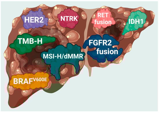 There are also several tumor-agnostic approvals that encompass CCA. For example, in May 2017, the FDA granted accelerated approval for the therapeutic monoclonal antibody, pembrolizumab, for microsatellite instability-high (MSI-H) or mismatch repair deficient (dMMR) unresectable or metastatic solid tumors that have progressed despite prior treatment [36]. In 2020, pembrolizumab received FDA approval for adults and children with high tumor mutational burden (TMB-H) solid tumors [37]. In August 2021, accelerated approval was granted for dostarlimab for adult patients with recurrent or advanced solid tumors identified as mismatch repair deficient (dMMR) as determined by an FDA-approved diagnostic test [38]. In 2018 and 2019, two therapies targeting neurotrophic tyrosine receptor kinase (NTRK) gene fusion, entrectinib and larotrectinib, were approved for locally advanced or metastatic solid tumors [39,40]. In June 2022, the FDA approved dabrafenib combined with trametinib to treat unresectable or metastatic solid tumors with a BRAFV600E mutation [41].