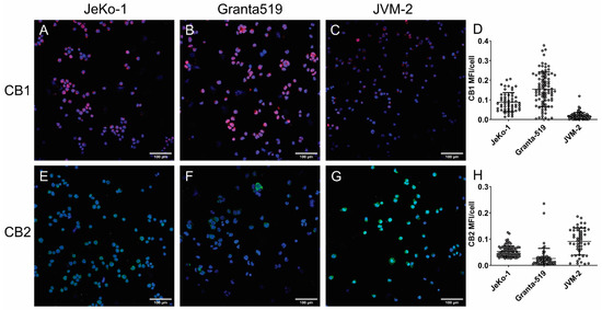 Cannabinoid receptor protein expression. CB1 expression can be visualized in red (TRITC) in (A) JeKo-1, (B) Granta-519, and (C) JVM-2 and CB2 in the green FITC channel in (E) JeKo-1, (F) Granta-519 and (G) JVM-2. DAPI (blue) is staining the nuclei. Mean fluorescence intensity (MFI) was quantified for each cell (grey circles) and is shown in panels (D) for CB1 and (H) for CB2.