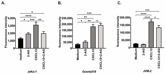 Chemotaxis of MCL cell lines. (A) JeKo-1, (B) Granta519, (C) JVM-2, cells were subjected to chemotaxis towards vehicle or 2-AG (100 nM), CXCL12 (200 ng/mL) or the combination of 2-AG and CXCL12; Paired t-test, ns: non-significant, * p < 0.05, ** p < 0.01, *** p < 0.001, **** p < 0.0001.