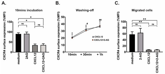CXCR4 surface expression in JeKo-1 cells (A) after 10 min incubation with 2-AG (100 nM), CXCL12 (200 ng/mL) or the combination of 2-AG and CXCL12 and (B) after washing off cells, then re-incubation for 30 min and 1 h with medium alone, shown as percentage of MFI normalized to non-treated cells. Paired t-test, ns: non-significant, * p < 0.05, Unpaired t-test, # p < 0.05 between 10 min and +30 min, ## p < 0.01 between 10 min and +1 h. (C) CXCR4 surface expression JeKo-1 cells after being subjected to 4 h chemotaxis towards the same conditions, shown as percentage of MFI normalized to non-migrated cells; Paired t-test, ns: non-significant, * p < 0.05, ** p < 0.01.
