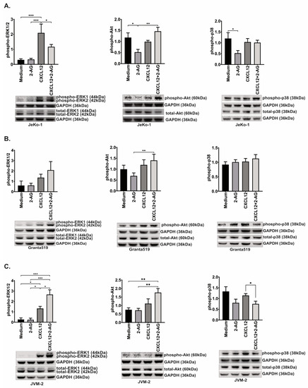 After 2 min incubation with CXCL12, we could observe a significant increase in p44/42 phosphorylation in JeKo-1 (7-fold increase, p < 0.001; Figure 7A) and JVM-2 (5-fold increase, p = 0.03; Figure 7C) but not Granta519 (p = 0.3; Figure 7B). 2-AG alone reduced the phosphorylation of p38 and Akt in JeKo-1 (2.3-fold decrease, p = 0.03 and p = 0.02, respectively).