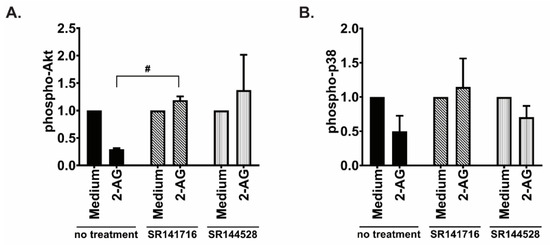 Effects of inhibiting the cannabinoid receptors on Akt and p38 activation. JeKo-1 cells were treated for 20 min with the CB1 antagonist SR141716 (10 nM), or with the CB2 inverse agonist SR1445282 (10 nM), prior to be incubated for 2 min with 2-AG. Activation of the signaling pathways (A) Akt and (B) p38 was assessed by Western blotting, normalizing phospho/GAPDH band intensity to total/GAPDH as described in Section 2, bars represent an average of the ratio of three repeats and error bars are standard error of the mean; 2-AG condition is shown as normalized to incubation with vehicle set as 1, unpaired t-test with Welch’s correction, # p < 0.05.